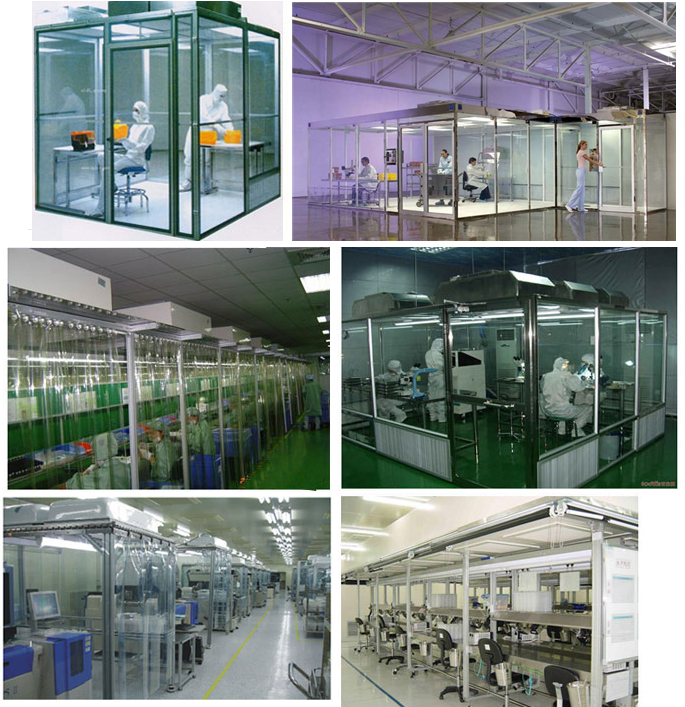 潔凈棚:采用工業(yè)鋁材(或不銹鋼方通、鐵方通噴塑)作為框架,風(fēng)機(jī)濾網(wǎng)機(jī)組(FFU)送風(fēng),四周懸掛防靜電垂簾(或鋼化玻璃),其內(nèi)部凈化級(jí)別可達(dá)到100~10000級(jí)。適用于操作區(qū)內(nèi)局部凈化級(jí)別要求高的區(qū)域。